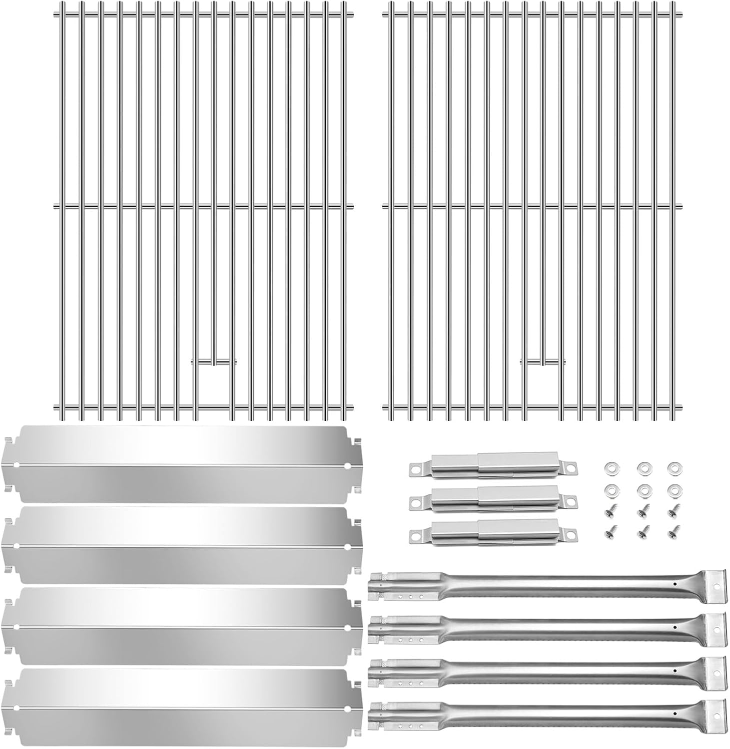 Compatible withGrill replacement parts for Charbroil Gas Grill Models:➤Charbroil 463268007➤Charbroil 463268008➤Charbroil 463268706 ➤Charbroil 463268606➤Charbroil 463248108➤Charbroil 461262407➤Charbroil 463248208➤Charbroil 463260307➤Charbroil 463261107Product Specification➤Grids Grates SpecificationDimension:18 1/4" x 13 1/8" each, with an overall size of 26 1/4" x 18 1/4"Material: Cast iron➤Heat PlatesDimension: 16" x 3-13/16"Material: Porcelain SteelOriginal Part Numbers: 80003332➤Grill Burner TubeDimension: 15-7/8" x 1"Material: Stainless SteelOriginal Part Numbers: g413-5000-01, 80005703, 80005591, 80006502, 80013421, cbp2 ➤Grill Crossover Tube Dimension: adjust from 5" - 9.5". Material: Stainless Steel. Original Part Numbers: g413-0004-01, 80009949, 80006583, 80010680, 80009028