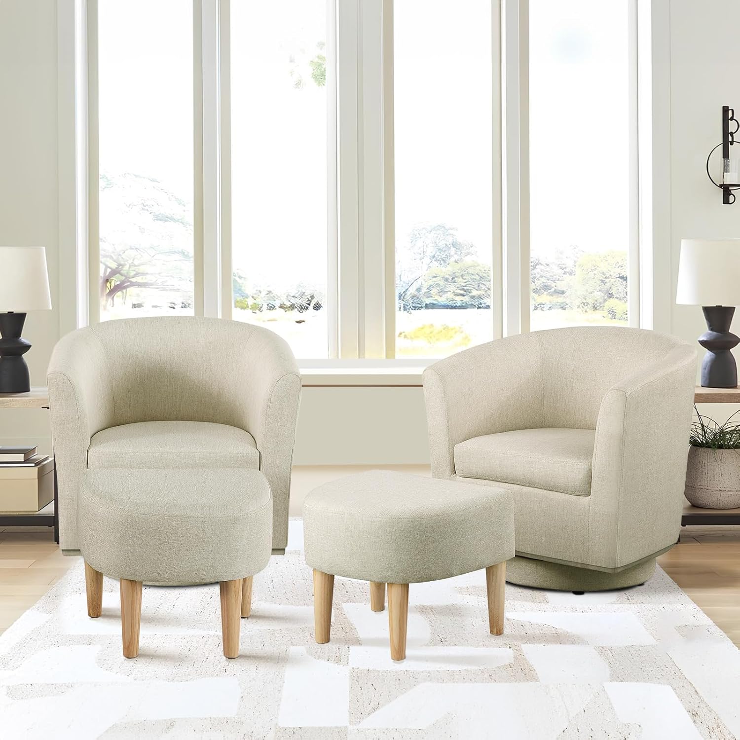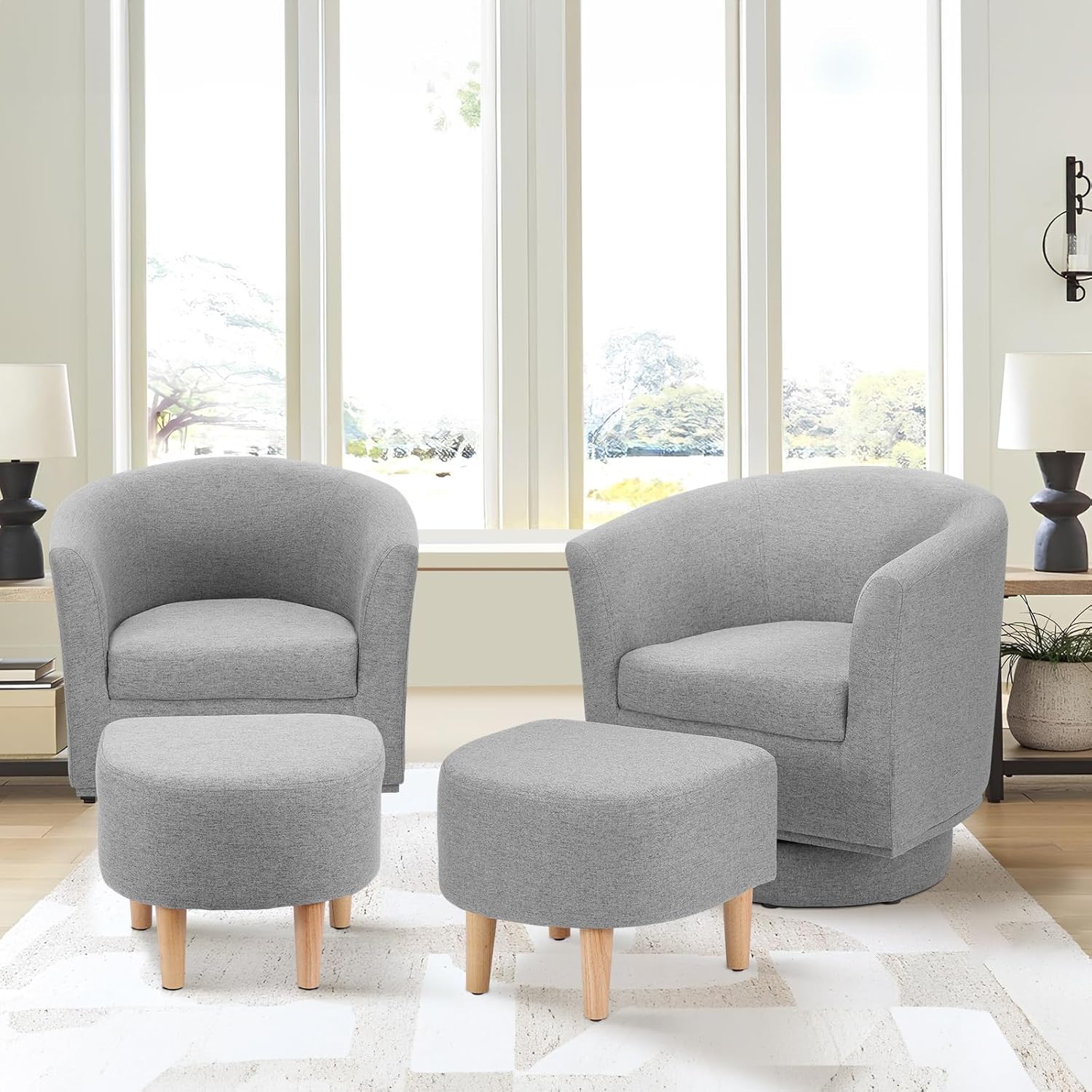 Bring comfort and modern style into your home with the DAZONE swivel accent chair with ottoman. Designed with a smooth 360° swivel base, this chair allows you to move freely while relaxing, reading, or enjoying conversations in your living space.The generously padded seat cushion provides soft yet supportive comfort, while the curved barrel back creates a cozy seating experience. The included ottoman offers a convenient place to rest your feet, helping you unwind after a long day.With its compact footprint, this swivel accent chair works beautifully in living rooms, bedrooms, apartments, or reading corners. The modern upholstered design blends easily with a wide range of interior styles, making it a versatile seating option for everyday living.Whether used as a reading chair, lounge chair, or accent piece, this swivel chair with ottoman adds both comfort and style to your home.