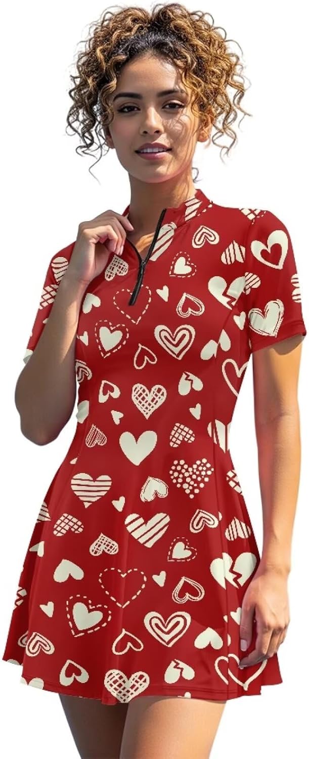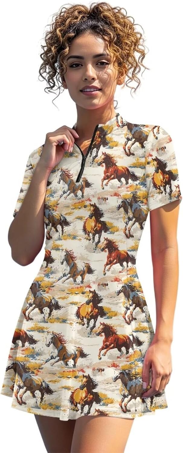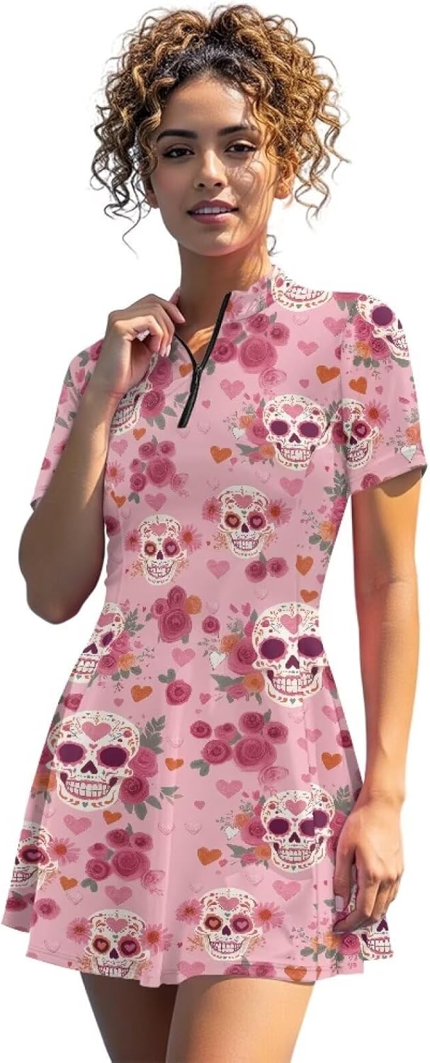 Darisoco Womens Golf Dresses Short Sleeve Collared Dress Built in Shorts for Ladies Half Zip Lapel Athletic Outfits Size Chart (Unit: Inch) XS: Length -- 31.1; Bust -- 32.28; Waist -- 27.56; Shorts Length-- 12.6; S: Length -- 31.89; Bust -- 33.86; Waist -- 29.13; Shorts Length-- 12.99; M: Length -- 32.68; Bust -- 36.22; Waist -- 33.86; Shorts Length-- 13.39; L: Length -- 33.46; Bust -- 38.58; Waist -- 33.86; Shorts Length-- 13.78; XL: Length -- 34.25; Bust -- 41.73; Waist -- 37.01; Shorts Length-- 14.17; 2XL: Length -- 35.04; Bust -- 44.88; Waist -- 40.16; Shorts Length-- 14.57; 2 IN 1 TENNIS DRESS should be on your radar when it comes to sports and leisure.Pairs best with daily play, designed to keep you relaxed from the moment you step in. Women's casual pullover Dress with 1/4 zipper V-neck design, easy to layer and better show your body curves. Sleeveless golf shirt is designed to slim your figure while keeping you unrestricted during exercise Tips Do not use bleach, hand wash or machine washable in cold water. please refer to our size chart for specific measurement methods to choose the right size. Please allow little color difference due to different camera or light environment Due to different measurement methods, it is reasonable for 1-2cm size deviation BUST: The body with flexible rule through the nipple horizontal position on a circle, is the length of the bust. SLEEVE: Using flexible rule on the arm, down the shoulders to the wrist measurement, we can choose the right sleeve length according to the data. LENGHT: Using a flexible rule from the intersection of neck and shoulder measurements, flexible rule should be perpendicular to the ground,quantity by the end of the length of the need to dress is the length. A variety of printing options, there must be one you like! The high-definition digital printing technology makes the pattern clearer.