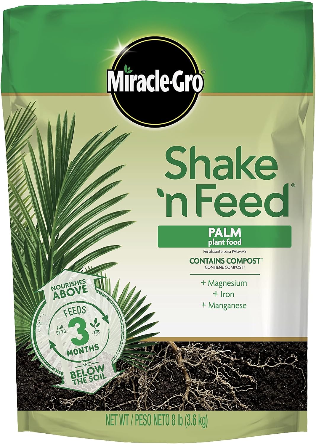 Nurture your palm trees and shrubs! Miracle-Gro® Shake 'n Feed® Palm Plant Food contains magnesium, iron and manganese to grow lush palms, cycads, and tropical plants and help prevent fronds from yellowing and curling. It also contains compost - microbes break down compost into nutrients that support root development which increases water efficiency and grows strong plants. This gardening product can be used with indoor or outdoor container plants, as wells as in-ground plants. To apply to in-ground plants and established container plants, shake evenly onto the soil within the spread of the palm's fronds using the recommended application rates on the label. Avoid contact with the trunk and foliage. Work plant food into the 1-3 inches of soil, then water to start feeding. When using with new container plants, mix into the soil at the time of planting, plant your palm as usual, and water to start feeding. For a beautiful garden all season long, reapply Miracle-Gro® Shake 'N Feed® Palm Plant Food every 3 months and water your plants regularly.