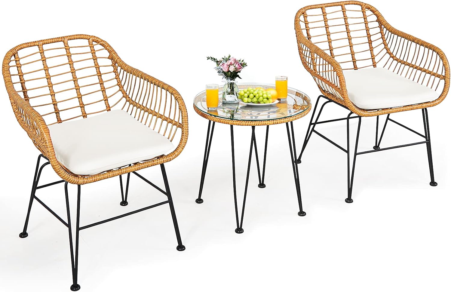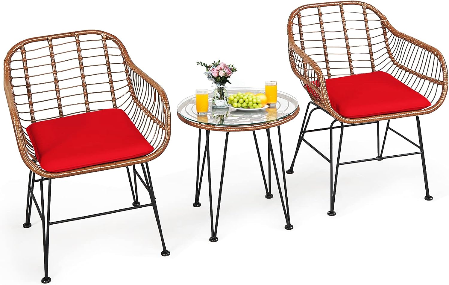 DescriptionThis outdoor patio wicker set is a great addition to your home, and you can place it in the patio, garden, balcony, poolside and so on. With stylish and simple appearance, this patio bistro set will add a sense of elegance to your space. With compact size and lightweight design, this conversation wicker set is easy to move and suitable for hotels, offices, apartments and other places with limited space. The smooth surface is easy to clean and maintain. In addition, the premium rattan and durable iron frame ensure long time service. The tempered glass tabletop can be used to place snakes, books and other daily necessities for easy access. This rattan furniture set with soft cushions allows you and your guests to sit together and enjoy the great outdoors.FeatureHigh quality rattan is durable enough to stand the test of timeIncluding 2 armchairs, 1 side table and 2 seat cushionsThe foot pads under the table and chair can prevent scratchesStable construction and iron legs provide strong stabilityTempered glass tabletop is sturdy and convenient to cleanSoft cushions for comfortable sitting experienceRemovable cushion covers are convenient to cleanIdeal for patio, porch, poolside, garden, balcony and so onEasy to assemble and maintainSpecificationColor of Rattan: BrownColor of Cushion: White/Red/Turquoise/NavyMaterial: Steel, Rattan, Sponge, PolyesterNet Weight: 44lbsArmchair Dimension: 20'' x 20'' x 31''(L x W x H)Table Dimension: 20'' x 20''(D x H)Height of Seat: 16.5''Weight Capacity of Each Armchair: 400lbsWeight Capacity of Table: 170lbsPackage include:2 x Armchair1 x Tempered Glass Table2 x Seat Cushion1 x Instruction