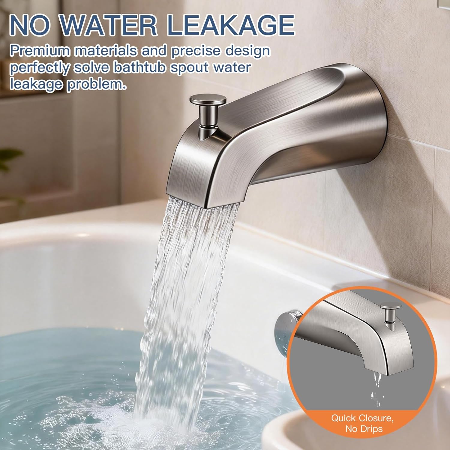 EASY TO USE:5.3" Bathtub Spout with Diverter Features a 5.3" length and an easy-lift diverter, allowing smooth switching from tub filling to shower use.Provides convenient operation for all ages, making daily bathing routines more effortless.Tested for durability and designed for standard U.S. bathroom setups DURABLE METAL CONSTRUCTION: Made from Brass, this adapter is corrosion-resistant, leak-proof, and much more durable than plastic options.It also prevents thread damage during installation, ensuring safe and long-lasting household water use PERFECT FIT: Compatible with 1/2" copper pipes (slip-on) and both 1/2" and 3/4" IPS threaded pipes, offering flexible installation for a wide range of bathtub plumbing setups EASY DIY PROJECT: The tub spout is designed for a hassle-free setup, allowing you to install your bathtub spout in just minutes without the need for professional tools,our bathtub spout with a universal size fits your standard bathroom tub, which can better solve your tub spout's leaking problem as a universal slip fit tub spout QUALITY ASSURANCE:We stand behind our product with a 30-day money-back guarantee and responsive customer support.If you encounter any issues, we’ll make it right
