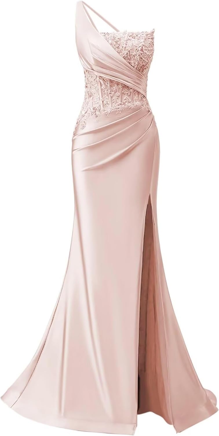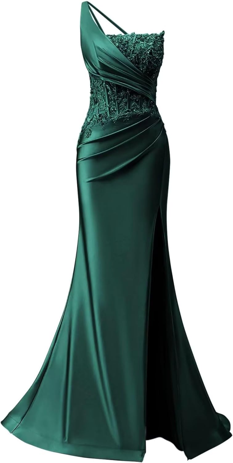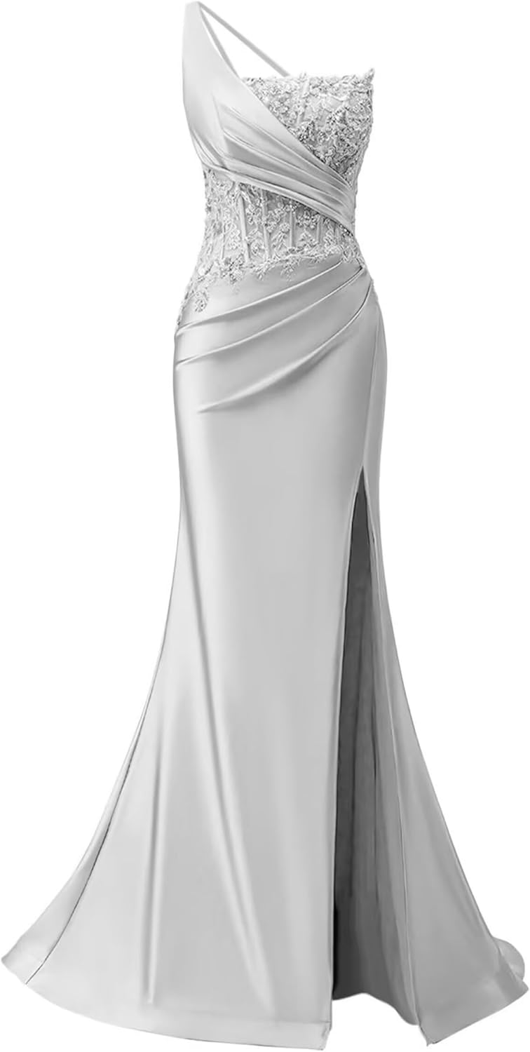 Zeeyecie One Shoulder Satin Prom Dresses Mermaid Lace Applique Beaded Evening Formal Ball Gowns with Slit